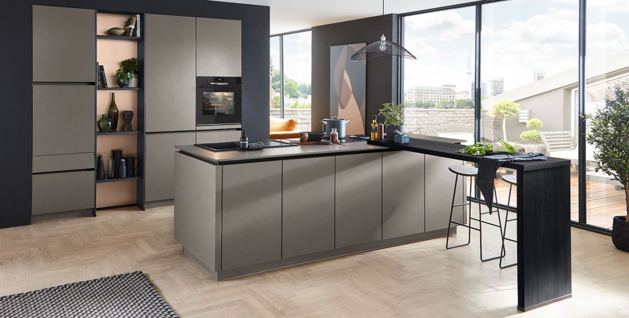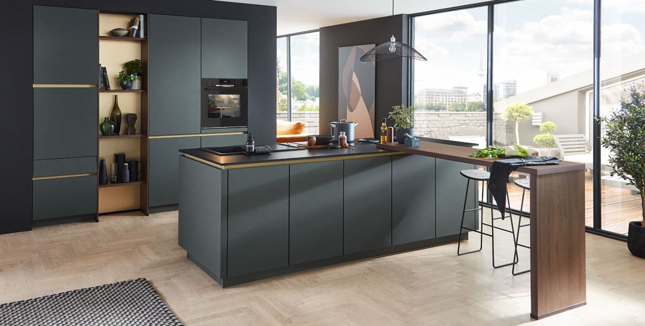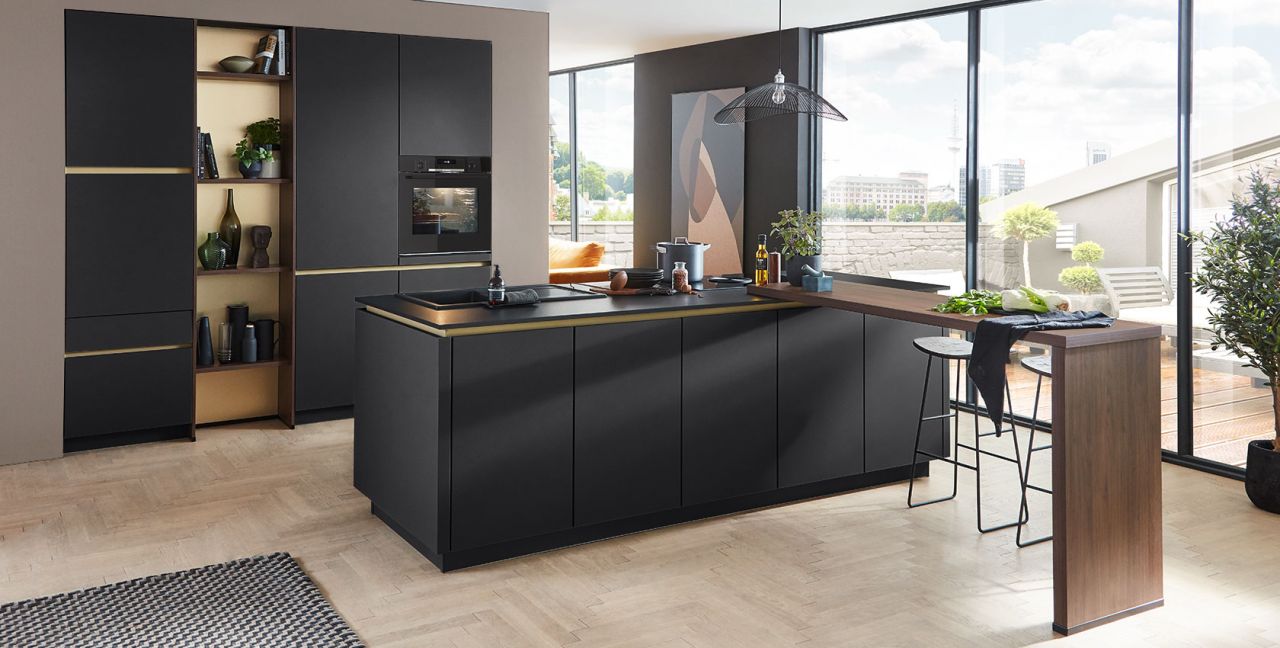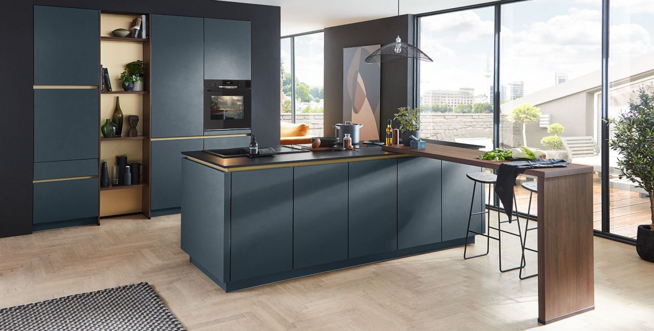 Inclusief inbouwoven zwart Bosch HBG578EB7 Energieklasse A+, keramische kookplaat met inductie en werkbladafzuiging (circulatielucht) Bora GP4U, koelkast Progress PK1215 Energieklasse E, inbouw-designspoelbak Elleci Logik 300, XL-kasten, onderkasten met grote laden, wandborden.