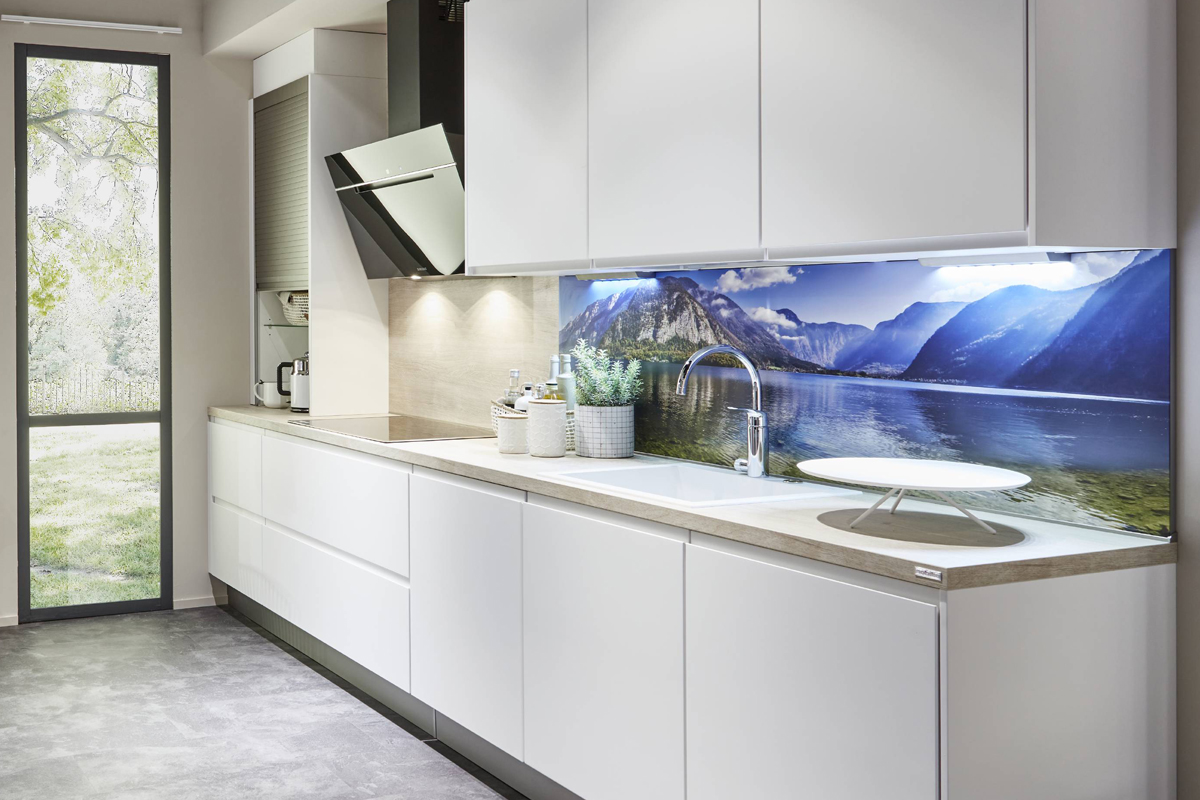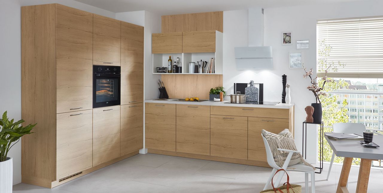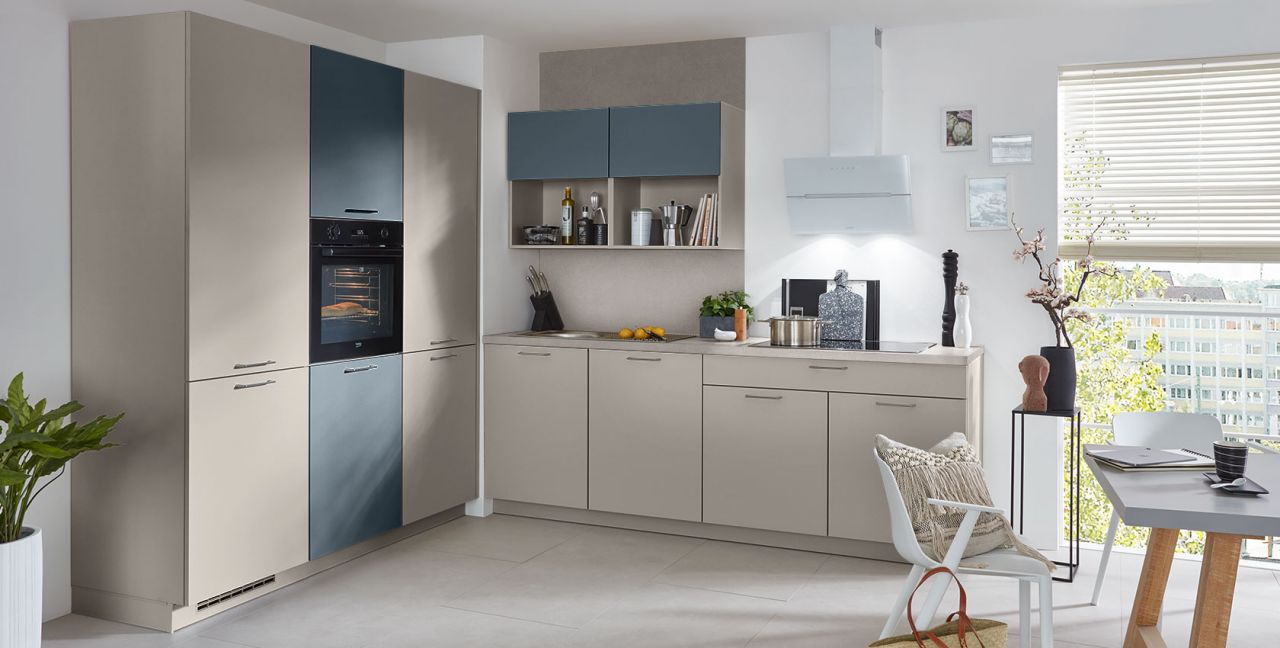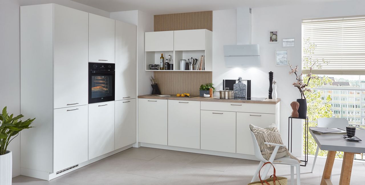 Inclusief inbouwoven Beko BBIM173N0BMPE Energieklasse A+, keramische kookplaat met inductie Beko HII84700UFTX, designschouw RVS / zwartglas Elica WISE90BK Energieklasse B, koelkast Beko BSSA210K4SN Energieklasse E, RVS-inbouwspoelbak Rodi Okio Line 85 Deep, XL-kasten, wand-schappenkast.
